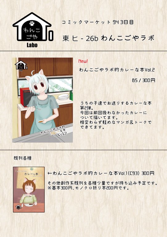 C93で発行したわんこごやラボ名義のカレー本『わんこごやラボ的カレーな本Vol.1』と創作の既刊を少量ですが持ち込み予定です。