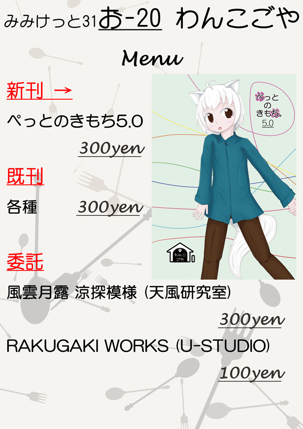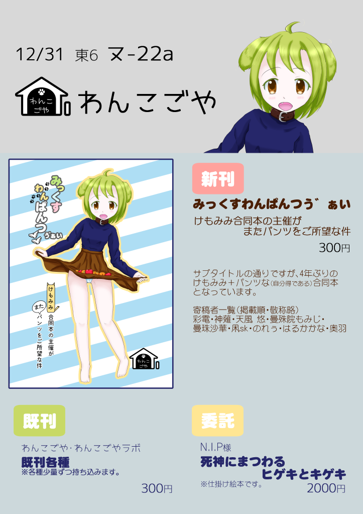 既刊を少量ですが前回のけもみみパンツ合同誌「みっくすわんぱんつう゛ぁい」と比較的新しい既刊を持ち込み予定です。価格は300円です。