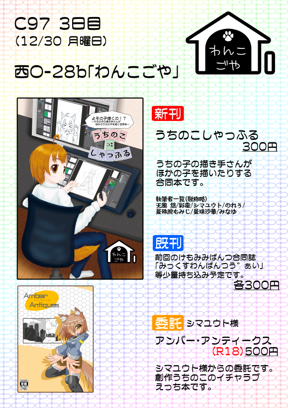 コミックマーケット97(2019/12/30(月) 3日目)西3ホール O-28b「わんこごや」にてサークル参加しています。